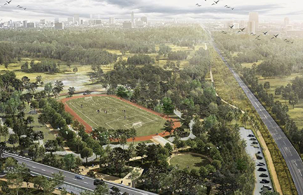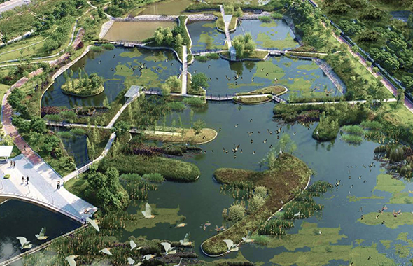 在植被设计上,金盏森林公园将结合场地现状,打造大尺度、特色突出的森林、湿地景观。常绿乔木、落叶乔木、灌木、水生及湿生植物、藤本植物、竹类、地被……各种植物将在多层次多物种近自然的种植理念引领下,在这里落地生根。而复层、异龄、混交种植模式的适当组合及合理布局,将使金盏森林公园的景观丰富多样,四季有景。